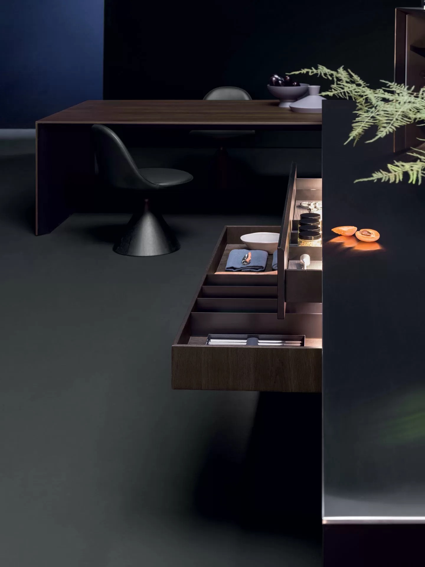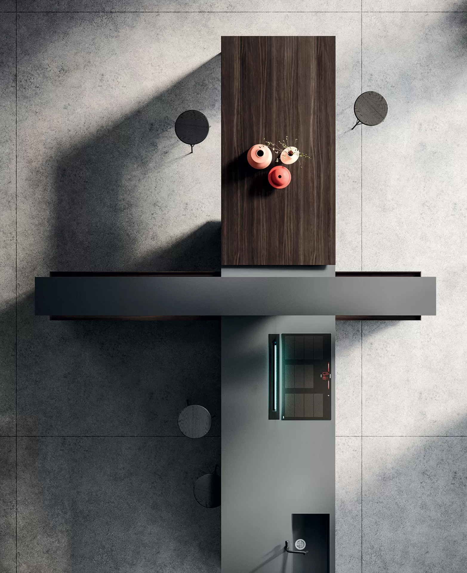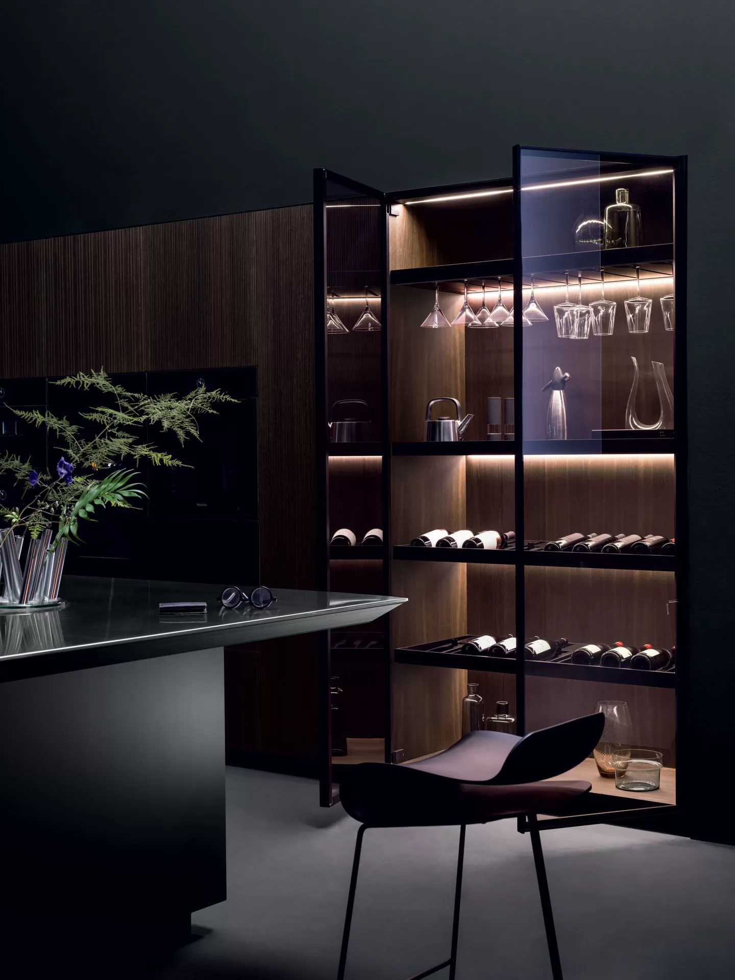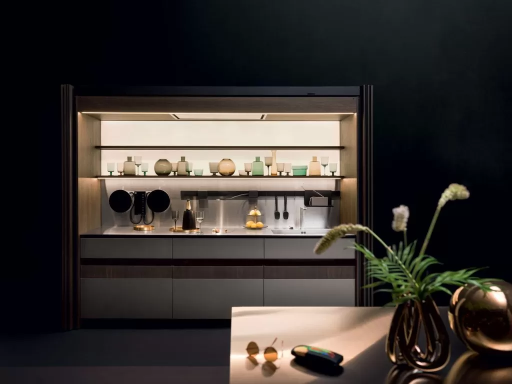 Il modulo Sipario cela elegantemente la zona operativa grazie alle ante a scomparsa con movimento assistito. Le ante delle colonne sono realizzate in Rovere Fumé con fresatura asimmetrica del legno, una particolare lavorazione della superficie che ne enfatizza la tridimensionalità.
