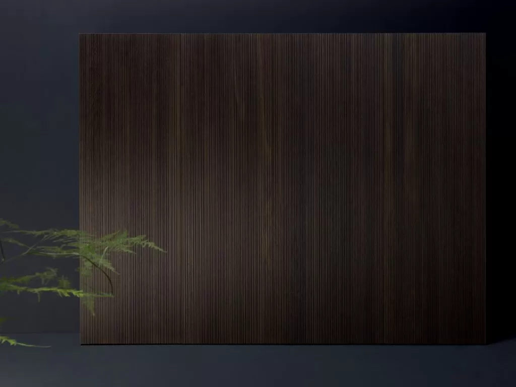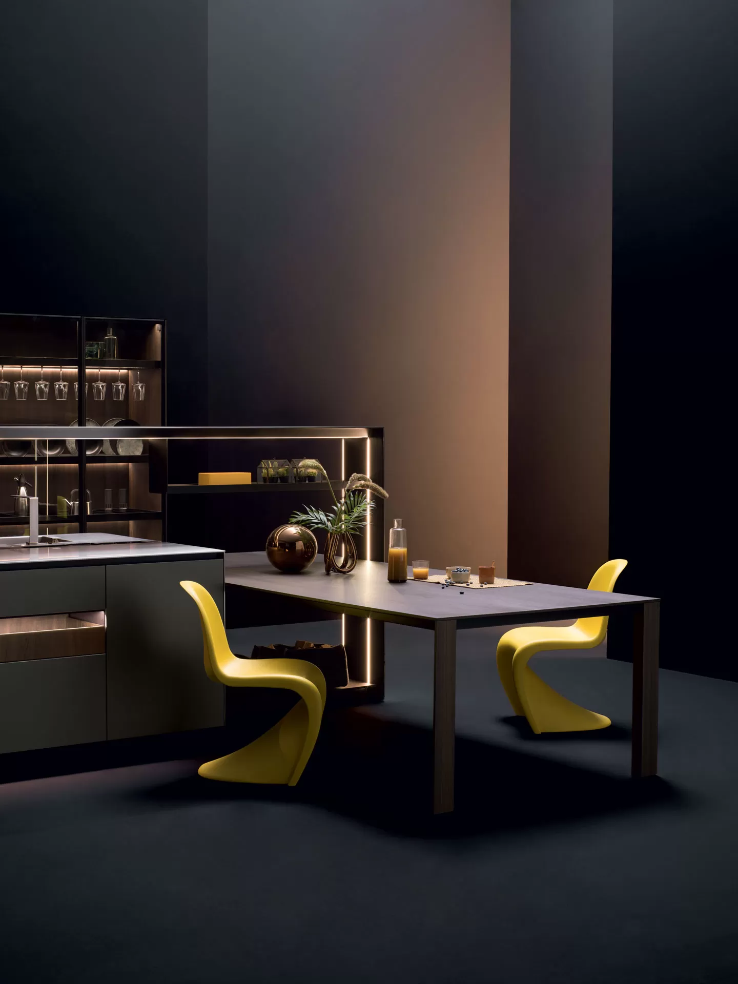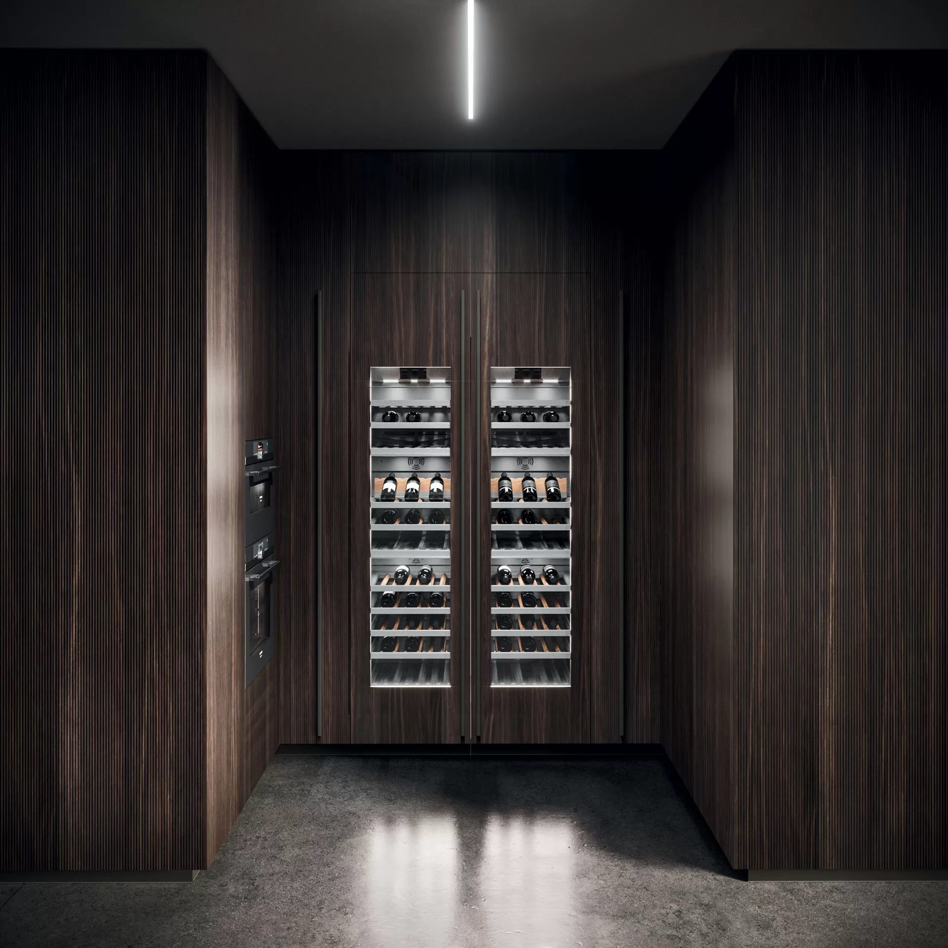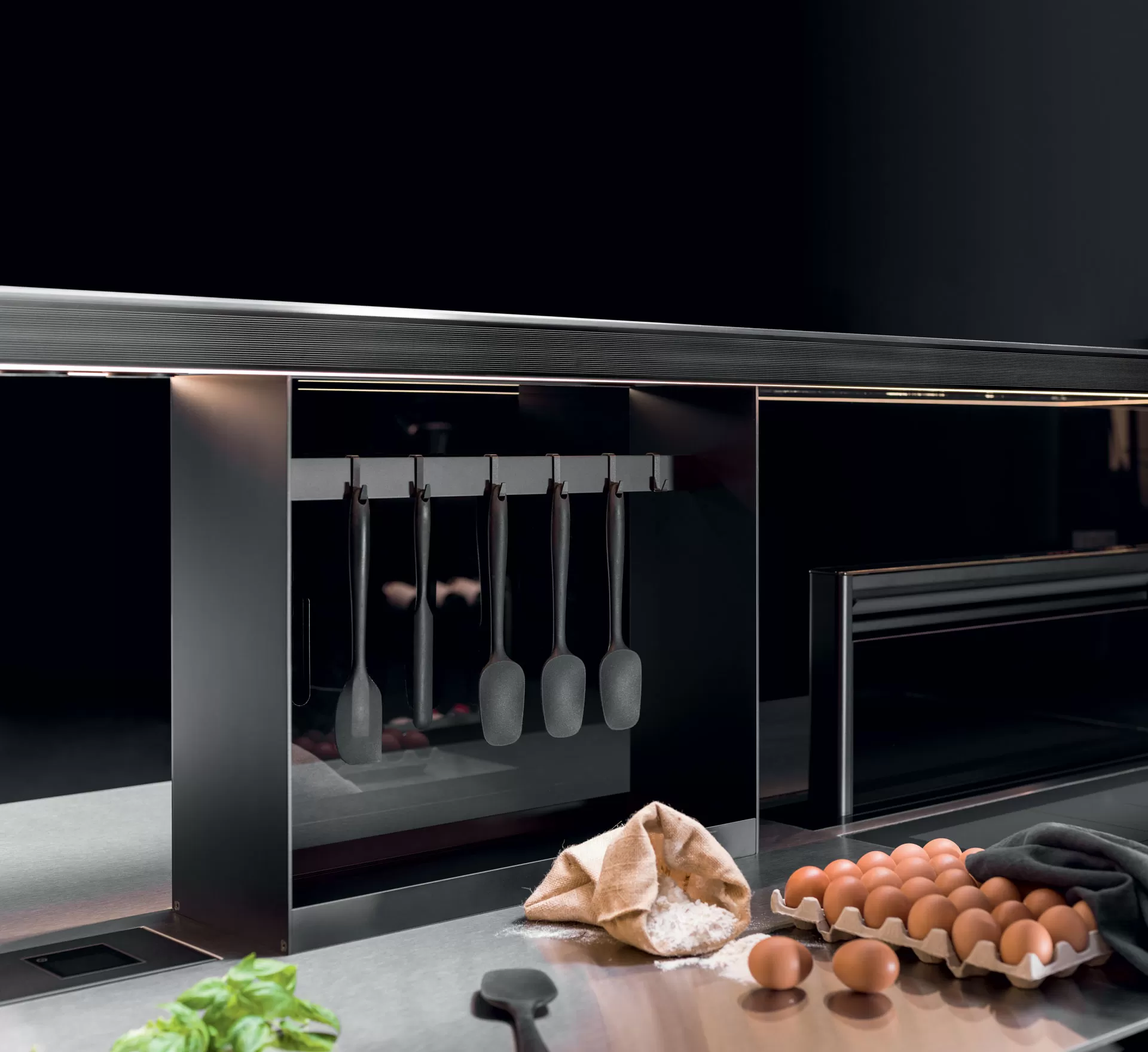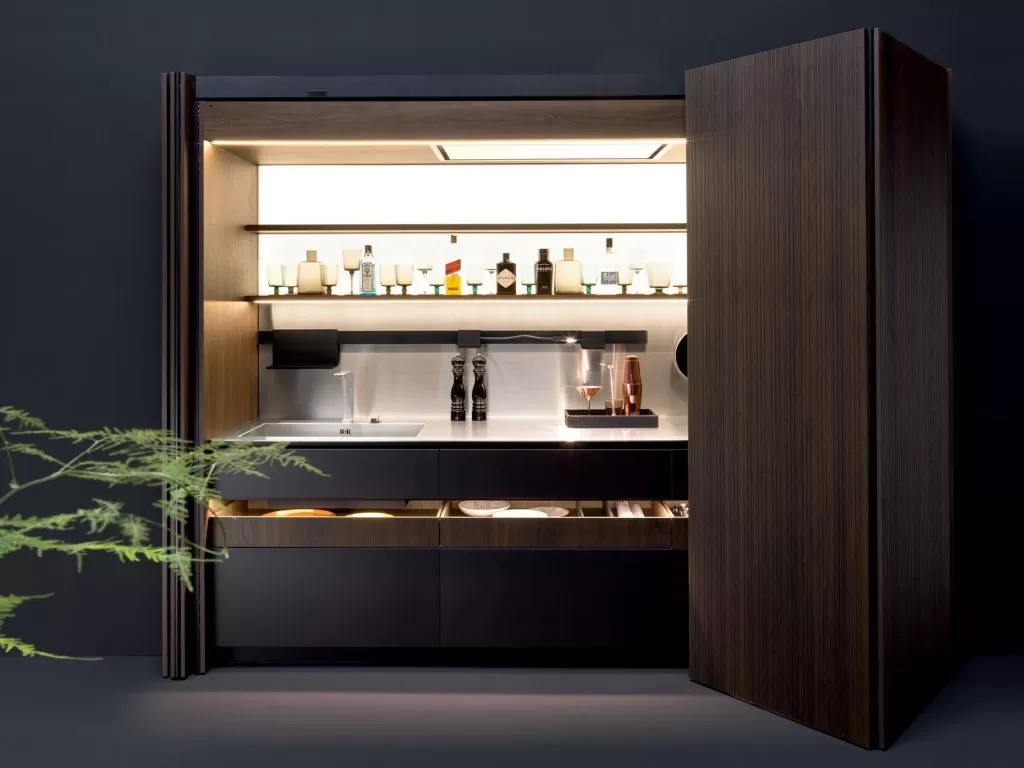 Il modulo Sipario cela elegantemente la zona operativa grazie alle ante a scomparsa con movimento assistito. Le ante delle colonne sono realizzate in Rovere Fumé con fresatura asimmetrica del legno, una particolare lavorazione della superficie che ne enfatizza la tridimensionalità.