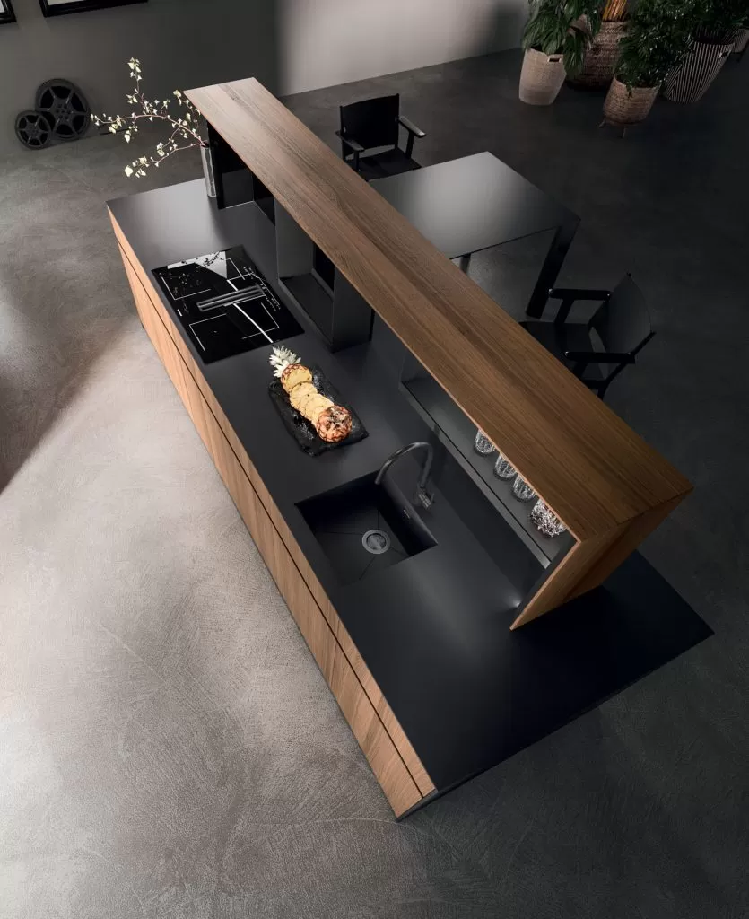 Equilibro dei contrasti: pietra, legno e alluminio sono le finiture che si possono trovare nella cucina Nautila di Arrital.
